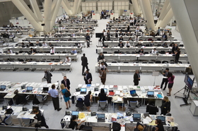 As the central base for newsgathering, the Press Center boasted as many as 400 work desks and chairs, with fixed-line telephones installed at 104 desks. There were also 20 working booths set up as part of an international broadcast center shared by various broadcasting stations.