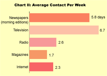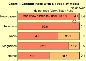 The latest survey found that 94.1 percent of the respondents had regular contact with newspapers, while 99.6 percent had contact with television (see Chart I). Of the five categories of media covered by the survey, the contact rate was more than 90 percent for newspapers and television. The average number of contacts per week was 5.8 days for newspapers and 6.7 days for television (see Chart II), confirming that newspapers and television lead the five media categories in contact rates.