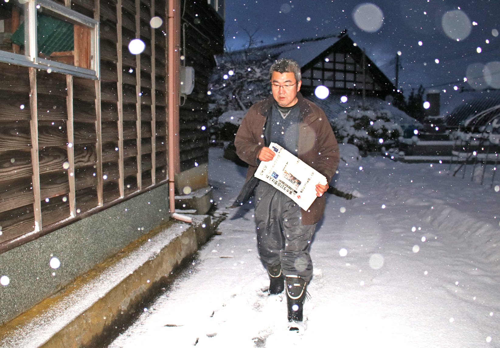 私の家では、新聞はポストに届かない。毎朝、「ゆう、新聞!」という声とともに縁側に届く。祖母はもう何十年も新聞配達の仕事をしている。最初のころは母や母の兄弟と手分けをして配達していたが、母たちが大人になってからは祖母が一人ですべての家を回っている。雨の日も、雪の日も、道に氷が張って歩きにくい日も、一人では持てないくらい重い新聞の束を手作りのカバンに入れて背負い、毎日暗い時間から徒歩で一軒ずつ配達している。家族からは「もう年だし、けがも心配だから、やめてもいいのではないか」と言われているが、祖母はやりがいを感じているようである。新聞配達の途中で地域の人たちと井戸端会議をしたり、自然や動物の音に耳を澄ませてみたり・・・・・・。