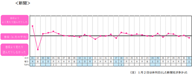 新聞や新聞社が発信する情報への接触が高まった上位3日は、以下の順番です。①1月1日(増ページ、元日の特集)