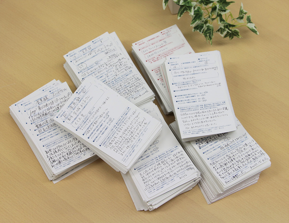 当誌の読者はがきには『ハルメク』への短い手紙を書いていただく欄があります。ここに寄せられるのは日常の報告や記事の感想などさまざまで、はがきを全て読むと読者の関心や日々の生活の空気感も伝わってきます。我々ははがきからコンテンツを作りそれらがビジネスに直結するので、はがきと徹底的に向き合っています。