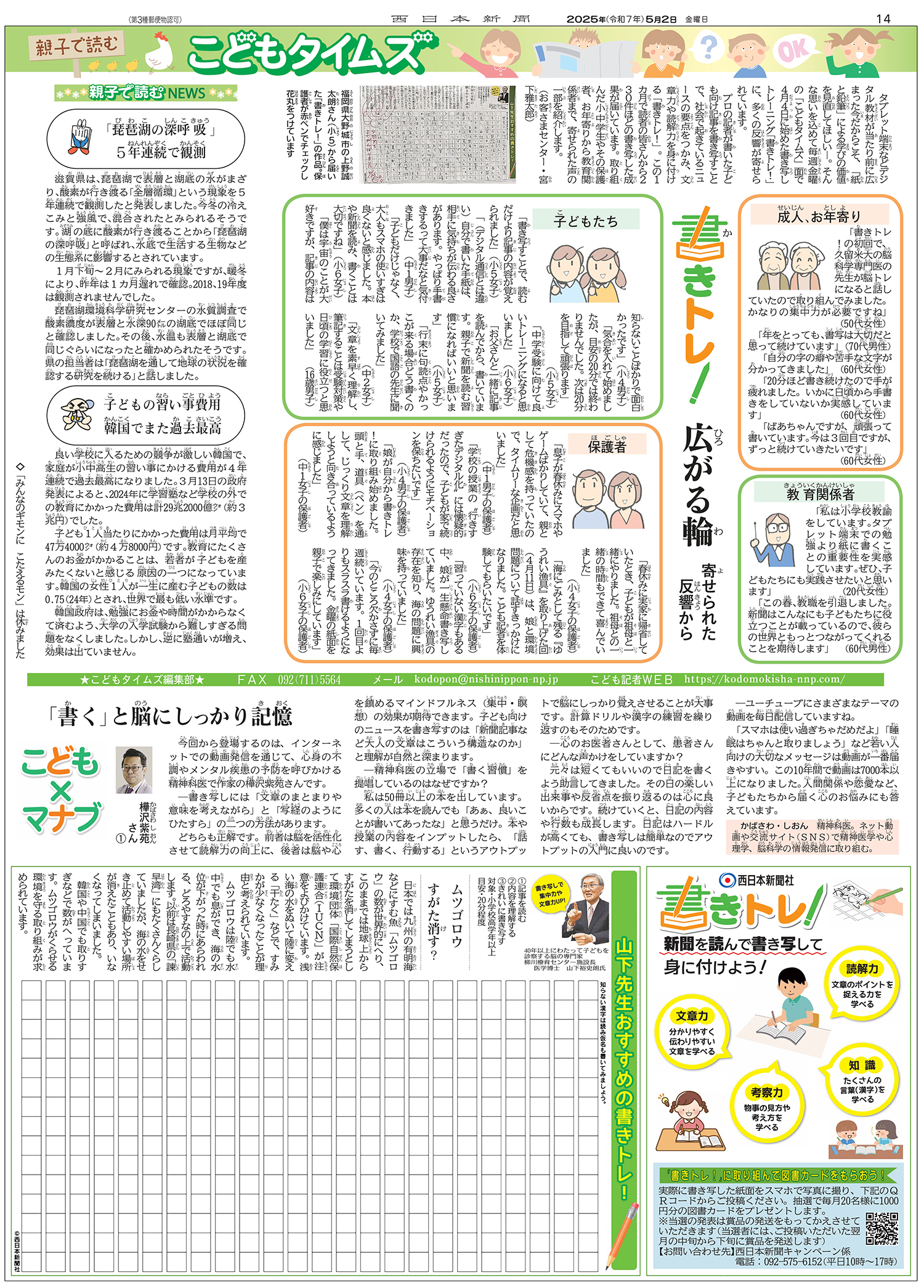 西日本新聞社では2025年4月から毎週金曜日付に、朝刊の小中学生向け紙面「こどもタイムズ」の一コーナー「書きトレ!」(商標登録出願済)の掲載を始めました。不確かな情報が飛び交う時代、デジタルネイティブの子どもたちにこそ「紙と鉛筆」による学びの力を知ってもらうことが狙いです。このコーナーのために、記者が子どもたちに知っておいてほしいテーマを分かりやすく記事にまとめています。子どもたちには、記事を読み、同じ紙面に用意されている原稿用紙欄に書き写すことで、ニュースの要点をつかむ力や文章力、社会に対する知識、考える力などを身につけてくれることを期待しています。