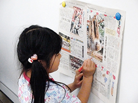 徳島県鳴門市の徳島新聞立岩専売所・渡邊卓史所長は毎月、幼稚園の年長預かり保育の園児約40人を対象に新聞◯付け教室を開催している。2人1組となった園児は、徳島新聞の子ども向けタブロイド判紙面から、指定された文字や単語に◯を付けてその個数を数えた後、引率の先生とのじゃんけんで勝った園児が、黒板に貼った紙面に◯を付け、最後に講師の渡邊所長が記事を説明する。