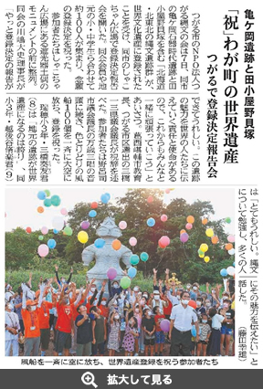 青森県内8遺跡を含む「北海道・北東北の縄文遺跡群」が2021年7月、世界文化遺産に登録された。このうち、東奥日報木造販売店があるつがる市には亀ケ岡石器時代遺跡、田(た)小屋(ごや)野(の)貝塚の2遺跡がある。川嶋大史店主は販売店経営の傍ら、かねてから地域の文化財を守り、後世に伝え残す活動を通して、登録実現に向けた地域の機運醸成に貢献している。