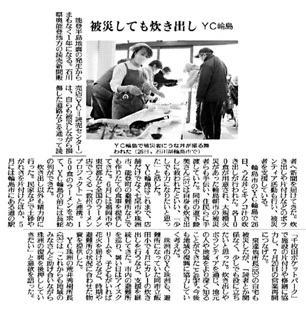 石川県輪島市の読売センター輪島の泉達也所長は、2024年1月1日に発生した能登半島地震により自宅半壊、販売店の全壊、3か月以上断水するなど自らも被災したにもかかわらず、率先して炊き出しやボランティア活動を行い、被災者を元気づけた。また、復旧のめどが立たなかった「道の駅」の片付けや修繕を新聞販売所スタッフと行い、営業再開を果たすなど観光業の復興にも貢献している。販売所の活動が読売新聞全国版に掲載され、それを読んだ北海道の読者が泉所長の活動に共感し、支援を申し出て炊き出しに加わった。