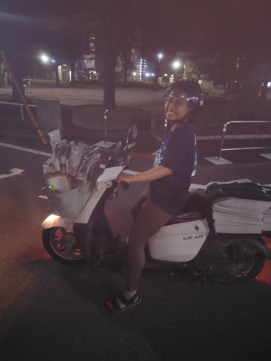 私は日本で新聞奨学生として働きながら学んでいます。午前1時から仕事が始まり、まず新聞にチラシを挟み、雨の日には1部ずつビニールで包んでからバイクに積み込みます。配達先は主に団地と呼ばれるアパートタイプの建物です。一般の住宅とは違い、バイクで玄関先まで配ることはできまません。建物に入って階段を上がったりポストの場所を探したりと、体力も時間も必要です。重い新聞を持ちながら何度も階段を上り下りする日は、汗がにじむほどです。