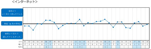 月1回以上新聞を読んでいる18歳以上69歳以下の男女計300人を対象に、普段と比べてメディアによく接したかどうかを毎日尋ねるウェブ調査です。毎月のトピックスを翌月下旬に発表しています。2017年10月1日から19年9月30日まで実施し、新型コロナウイルスの感染拡大に伴うメディア接触状況の変化を調べるため、20年6月より調査を再開しました。新聞、テレビ、インターネットのメディア別に、当該月平均と比較したデーリーの接触状況を公表します。事件や事故、政治・経済の状況に加え、大きなイベントや正月など消費行動にもつながる各種タイミングでのメディア接触、季節変動などを観測します。